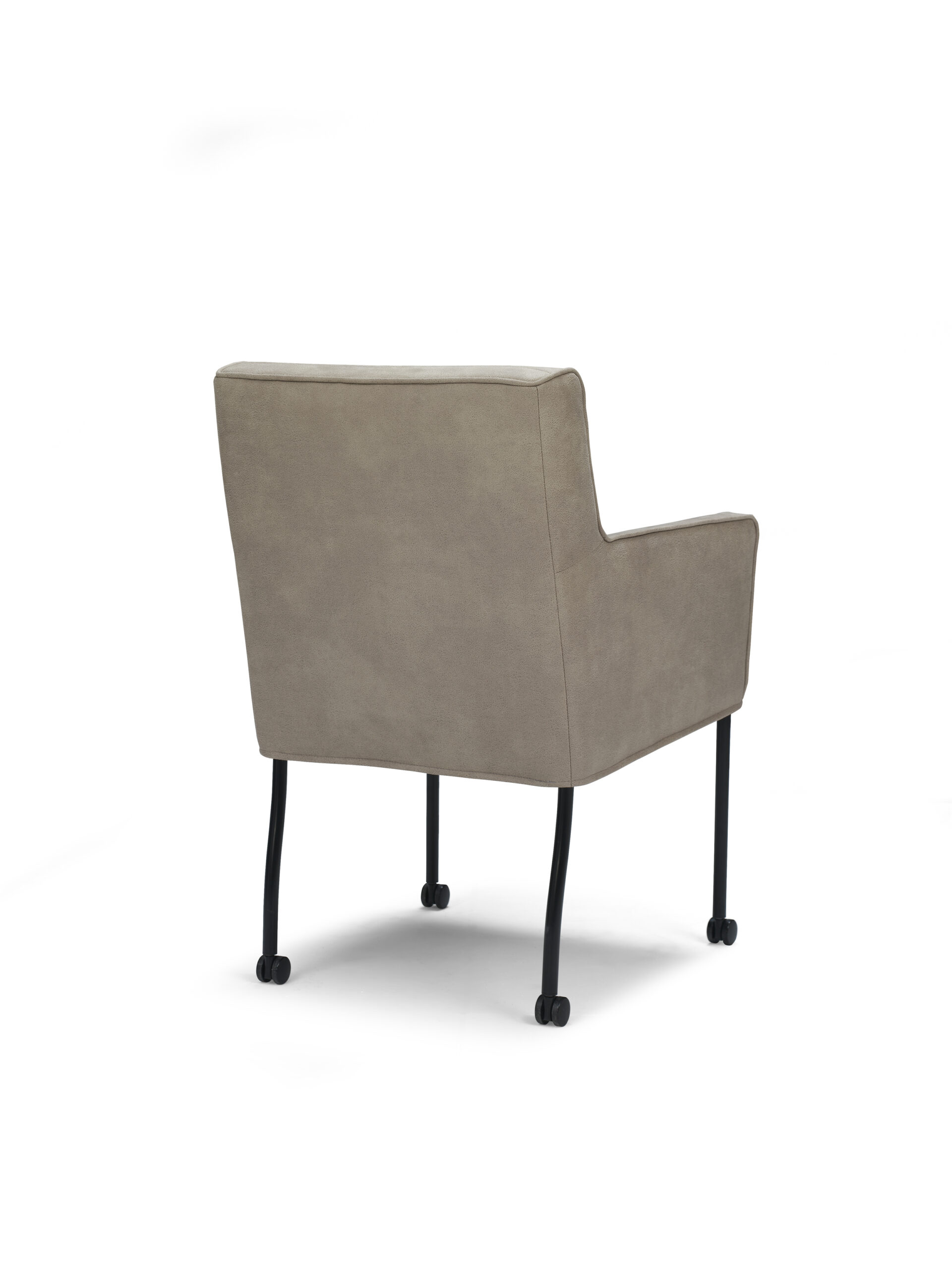De Maspalomas eetkamerstoel met armleuningen en stijlvolle stiknaden in de rugleuning combineert een stoer design met optimaal zitcomfort. Dankzij de stevige rugleuning, comfortabele zitting en armleuningen geniet je van lange diners. Verkrijgbaar in diverse stoffen, leersoorten en kleuren. Voor extra gemak is de metalen poot optioneel met zwarte wielen.