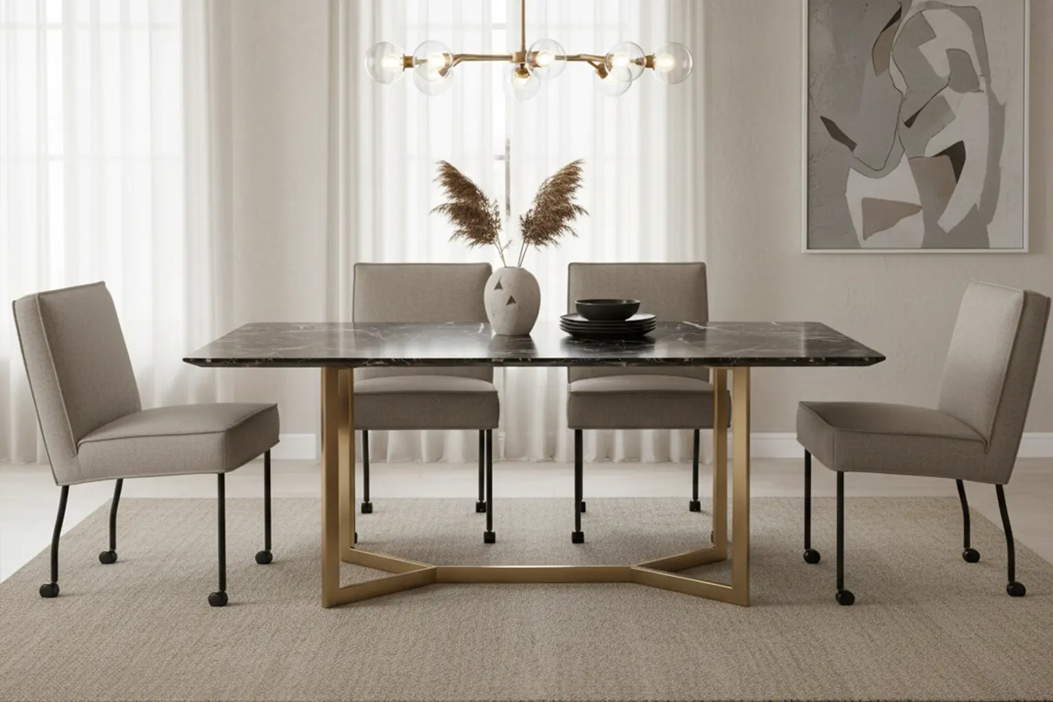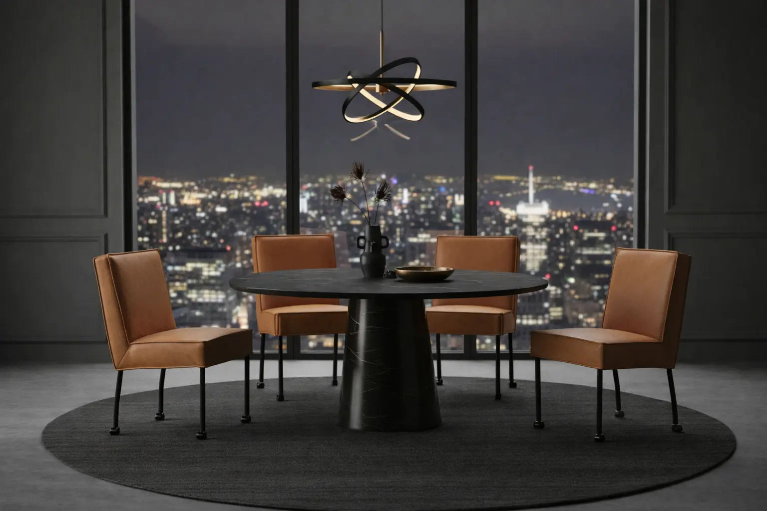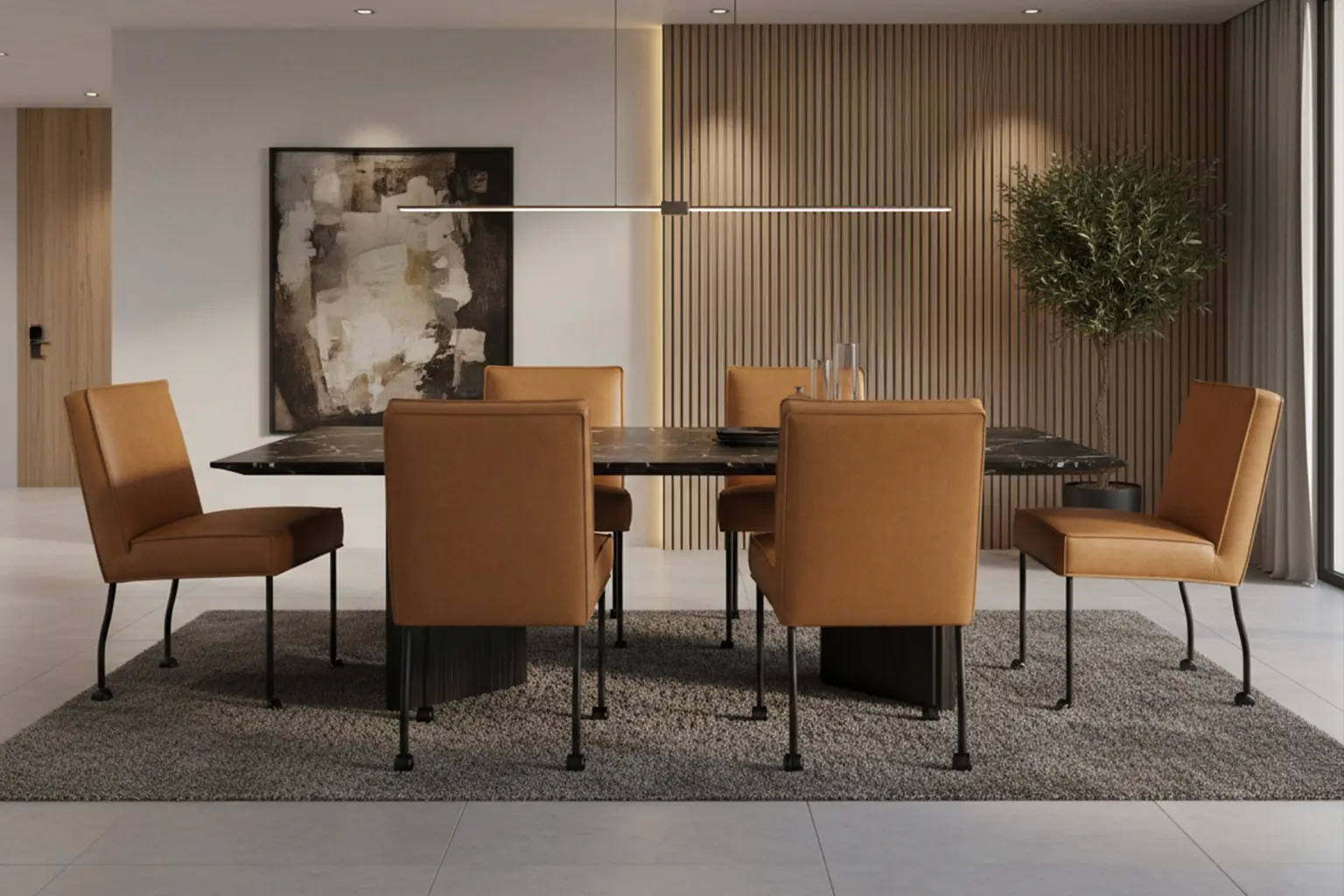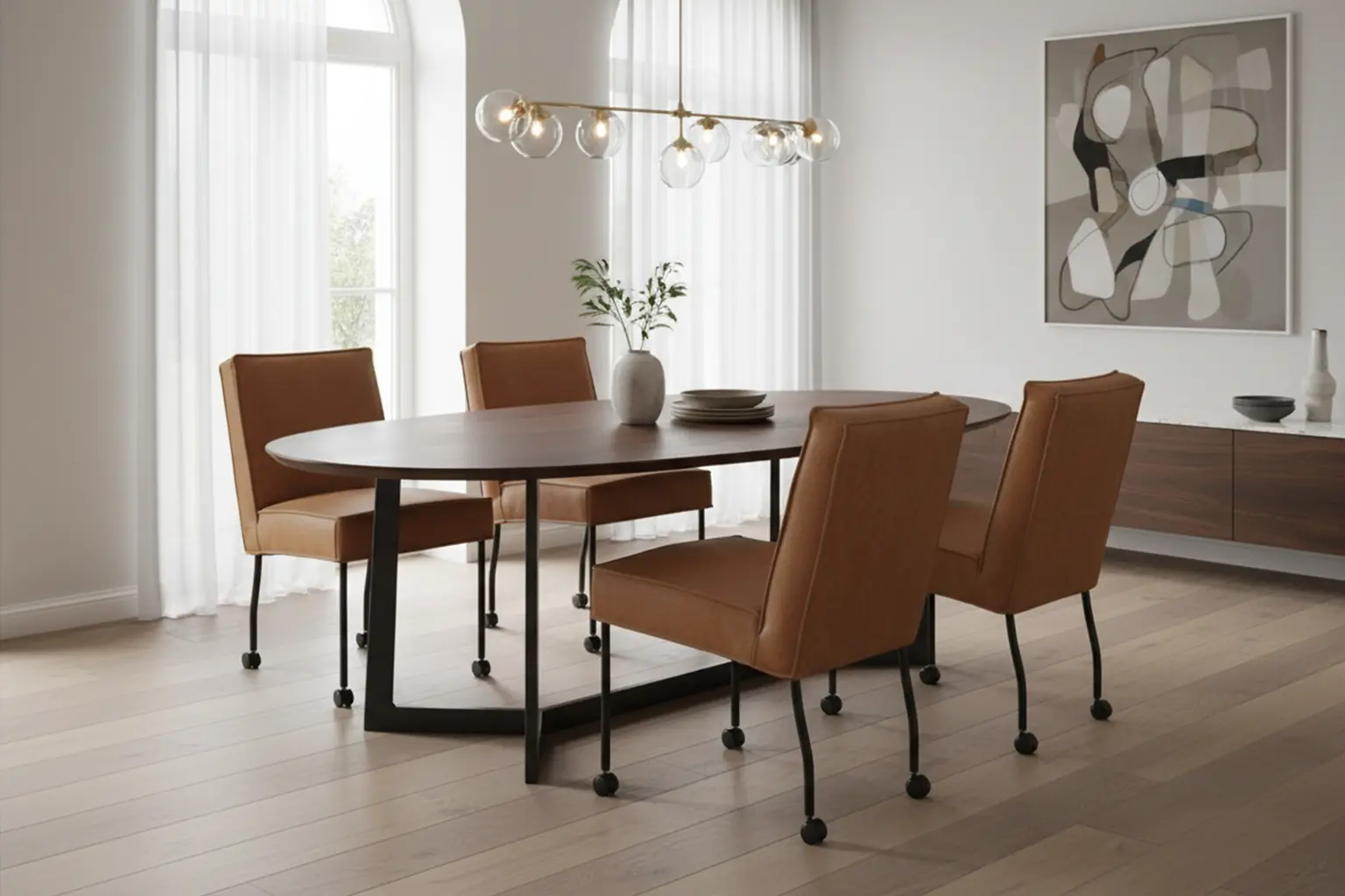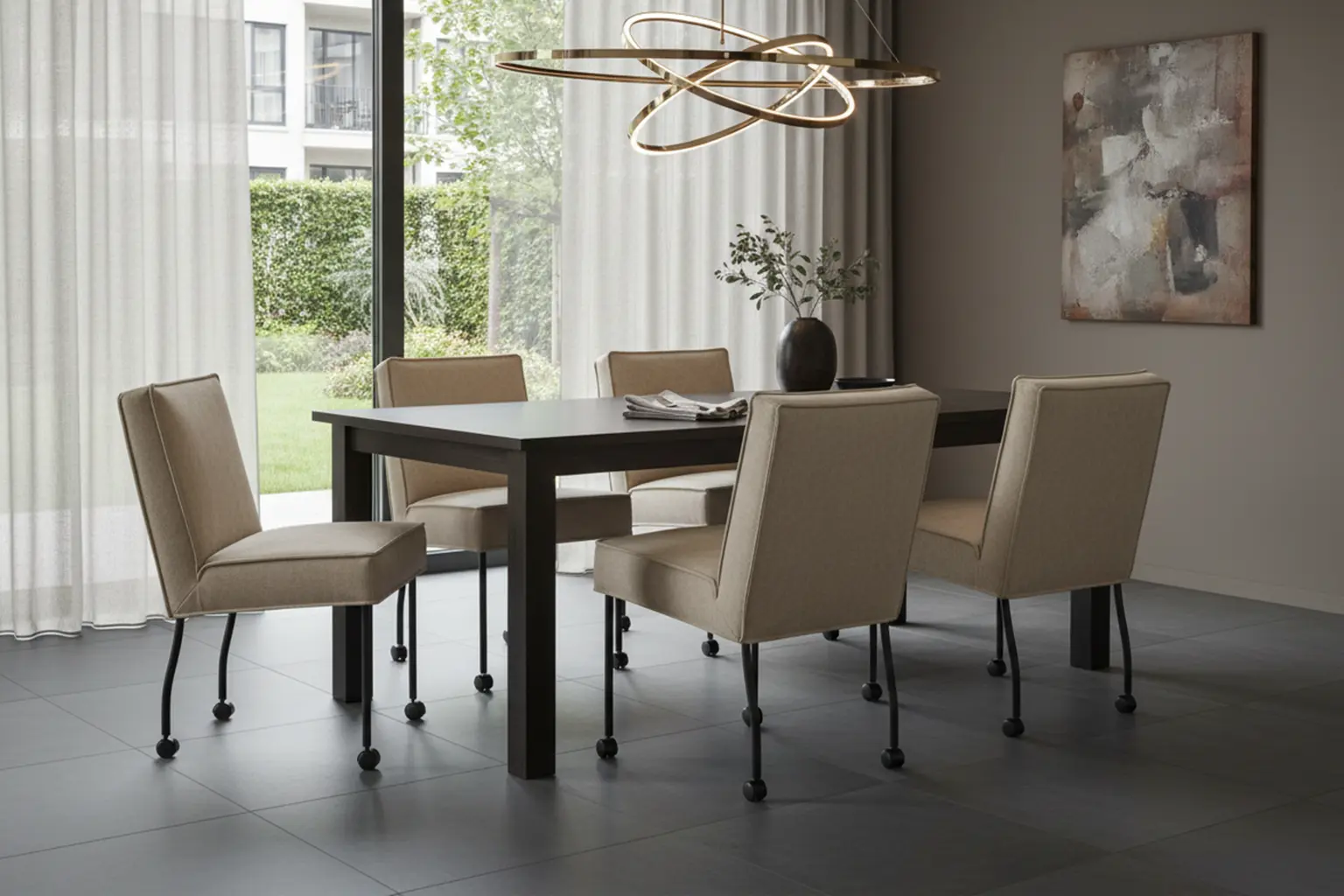 De Sevilla eetkamerstoel zonder armleuning biedt een stoer design en optimaal zitcomfort. Dankzij de stevige rugleuning en comfortabele zitting geniet je van lange diners. Verkrijgbaar in diverse stoffen, leersoorten en kleuren. Voor extra gemak is de metalen poot optioneel met zwarte wielen. Liever met armleuningen? Kies voor de eetkamerstoel Soria.